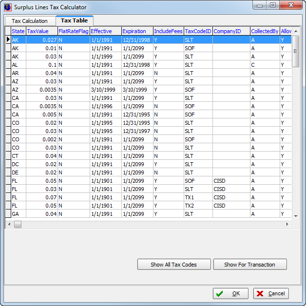 On the Tax Table tab of the Surplus Lines Tax Calculator, you can view the tax table from Data Maintenance Utility (DMU). The information on the Tax Table tab is read only, meaning that you cannot make changes to the tax table from AIM.