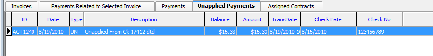 On the Unapplied Payments tab, you can view any payments for the producer that is assigned to the selected policy that have not yet been applied to an invoice.