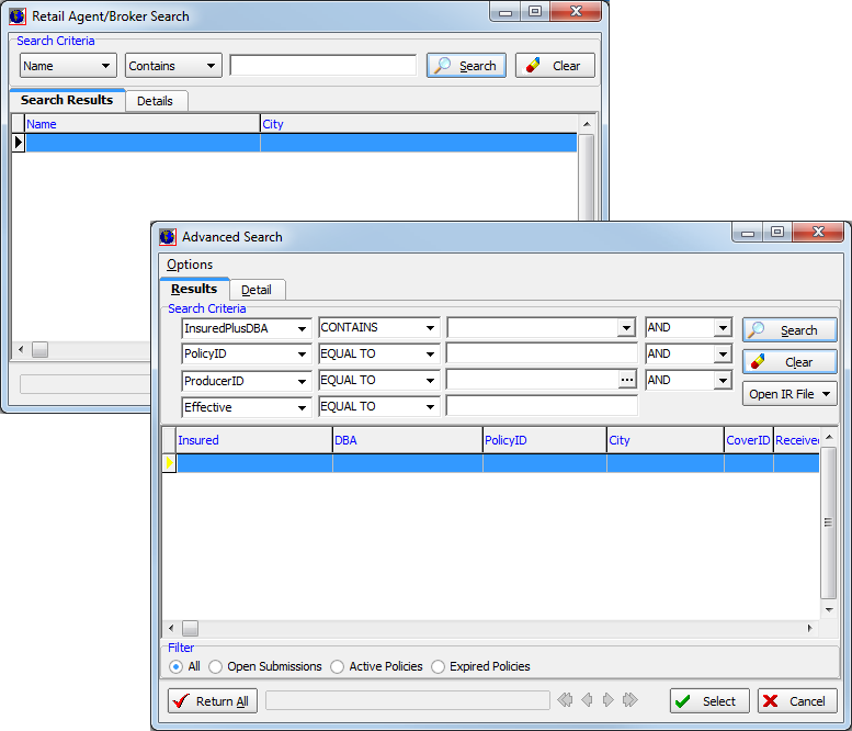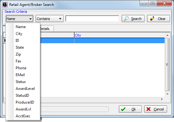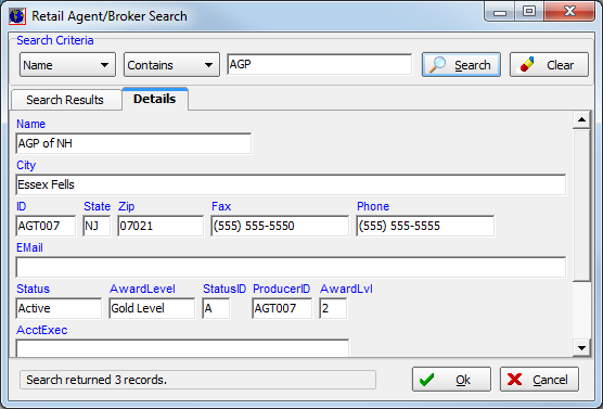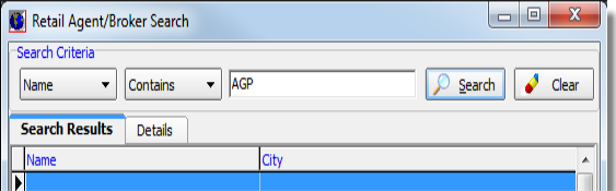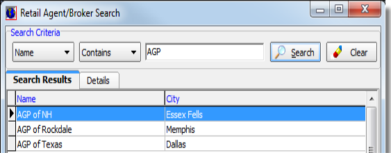 - Use the specific information located on the Search Results tab to identify which retail agent/broker that you want to select. The columns in the Search Results grid contain the same information that we described when specifying the search criteria. Select the retail agent/broker from the list.
