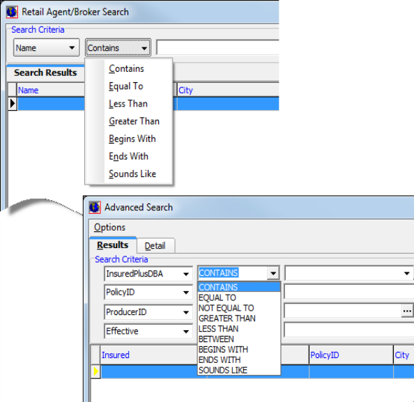 As you work in AIM, you will find it necessary to perform searches for a variety of subjects. For example, you may need to search for an agent/broker, insured, or a company. We will show you how to perform a search using the most frequently used type of dialog box and using a wide range of search methods and operators.