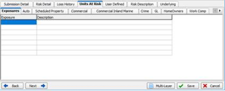 The Units At Risk tab is divided into multiple tabs for the purpose of fully documenting insured risks. Information about a specific type of risk can be specified on each tab as needed.