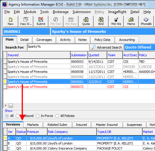 The Versions tab located on the Main tab displays versions of the selected quote or submission. Important information about the status, risk company, market company, and more is displayed.