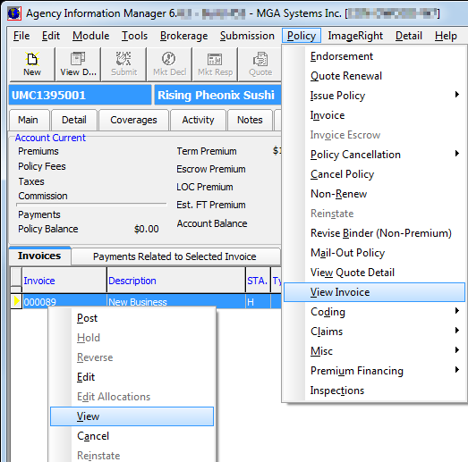 Alternatively, you can also click the Accounting tab, right-click the invoice record, and then select View from the resulting menu.