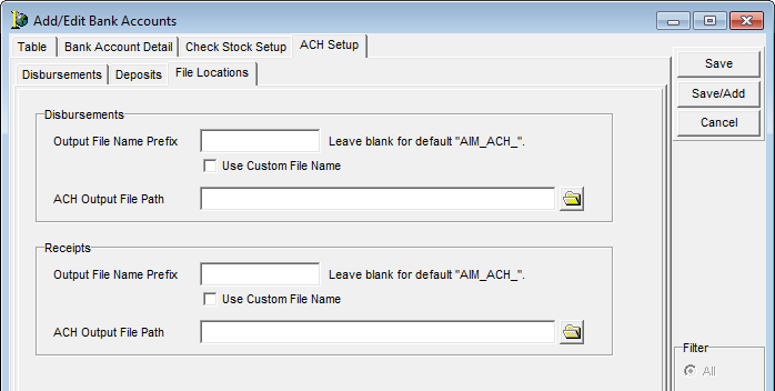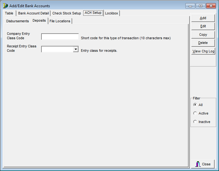 The ACH Setup tab, located in the Add/Edit Bank Accounts dialog box, is used to configure the use of output of files and receipts to the automated clearing house (ACH). Refer to the Setup ACH Help topic for more information.