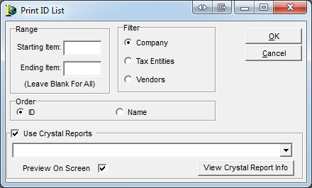 - In the Range pane, enter a range of ID numbers, or leave blank for all ID numbers.