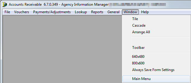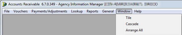 The functions of the Window menu are identical across all modules of AIM Accounting. In this topic, we show you the Window menu from Accounts Receivable.