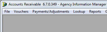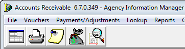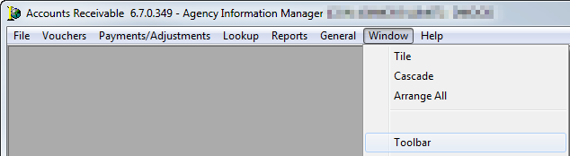 The Toolbar command, located on the Window menu is used to display or not display the AIM Accounting toolbar. You can enable or disable the toolbar by clicking the Toolbar command.