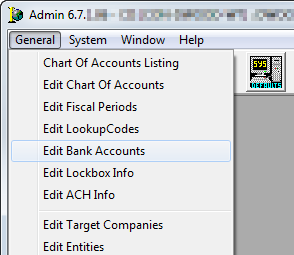 - In the Admin module, click the General menu, and then click Edit Bank Accounts.