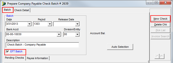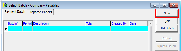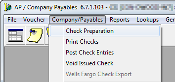 - In the Company Payables module, click the Company/Payables menu, and then click Check Preparation.