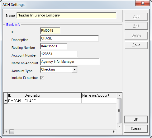 - If this is the first time you are paying this company with an ACH the ACH Settings dialog box appears for you to complete. Enter the following information in the Bank Info group box: