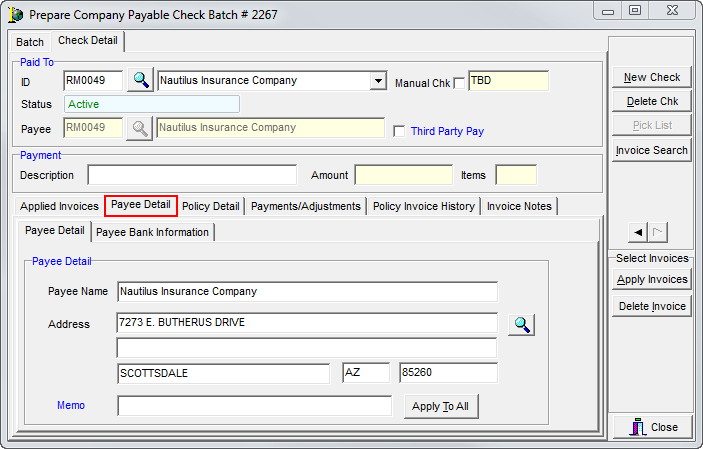 - Click the Payee Detail tab and verify that the payee information is correct.