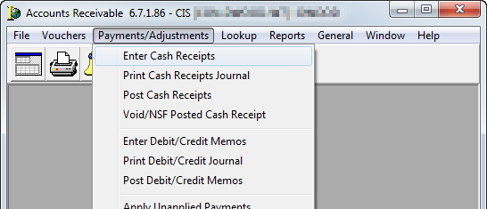 - In Accounts Receivable, click the Payments/Adjustments menu, and then click Enter Cash Receipts.