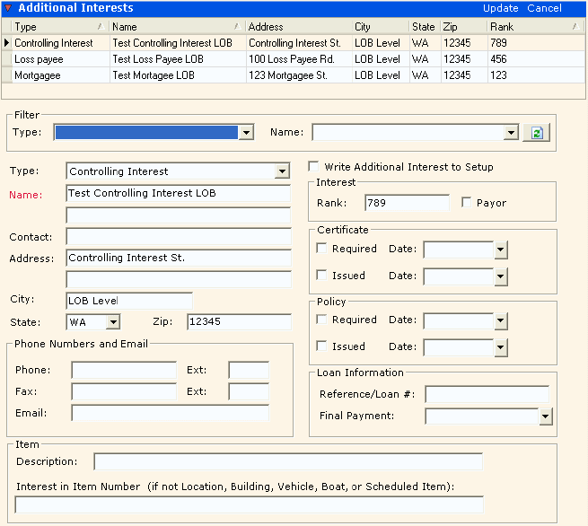 If there is one Additional Interest under Line of Business, and one under Vehicle Information, then the Vehicle Information interest will overflow to the ACORD 45. In this case, only the Line of Business interest will flow to ACORD 127.