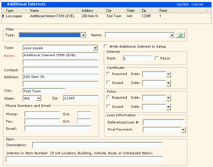 This policy applicant information originates in Customer Setup > Name and Address. If you click the button Update from Customer, information automatically flows from Customer Setup into these fields.