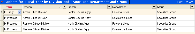 - Highlight a row in the grid and click Edit to open the budget grid for a business unit combination to allow for adjustment of account amounts.