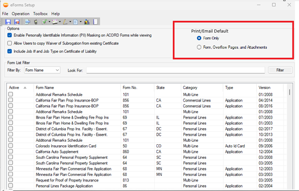 A new option has been added to eForms Setup data entry in the Administration center. This enables you to choose to include the Job # and Job Type to be mapped to the ACORD 25 (2016/03) version of the Certificate of Liability form.