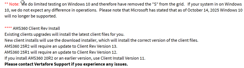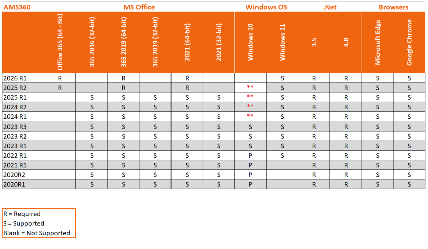 AMS360 Software Support Matrix