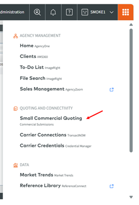 When you click on the hamburger icon (three lines) a drop-down menu appears. The Vertafore Suite will be found in the drop-down, illustrated by the Bento Box icon.