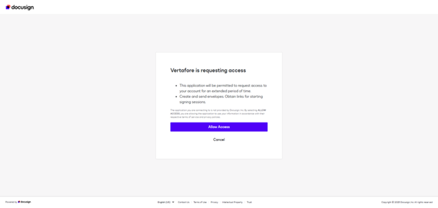 - If this is the first time you have logged into Docusign, or if it has been more than 30 days since your last login, you will be taken to the two Docusign pages shown below to enter your Vertafore-provisioned user name and password, and to Allow Access to use the Vertafore Docusign integration.