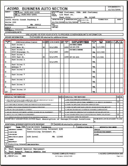 In AMS360, information flows from the Policy > Line of Business > Business Auto > Driver Information fields into this section of ACORD 127.