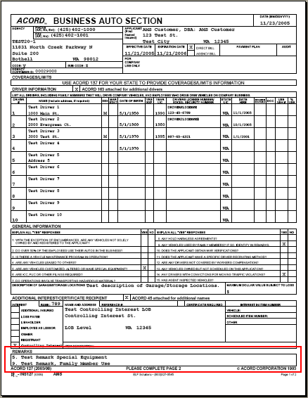 In AMS360, information flows from the Policy > Line of Business > Business Auto > Remarks field into this section of ACORD 127.