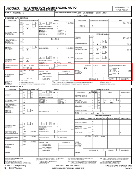 In AMS360, information flows from the Policy > Business Auto - Line of Business > Hired/Non-Owned/Drive Other Car > Hired/Borrowed fields into this section of ACORD 137.