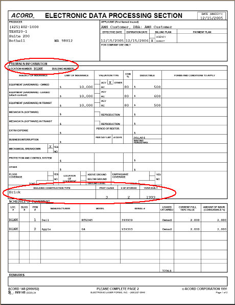 If the coverage is location-specific, then the Location Number and Building Number appear on the form. For blanket coverage, the abbreviation BLNK appears on the form.