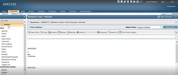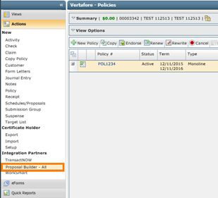 Type a customer name in the search bar, then click Search. Click on the appropriate customer, and select the policy you want to include in your proposal.