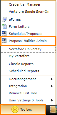 This launch point is specifically for Admins to customize Proposal Builder for their organization. They can also view all proposals that have been initiated (i.e. those that are in New, In Progress, or Generated status) from their instance of AMS360.