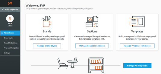Admins can customize every aspect of their organization’s proposals to ensure consistent branding style, messaging, and proposal structure. The initial setup can take as little as 20 minutes, but it needs to be completed before Account Managers can begin creating proposals.
