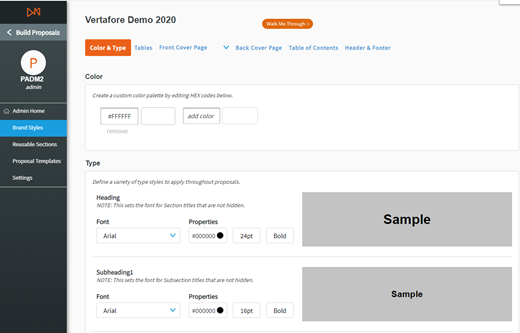 Brand Styles allows admins to set standard style formats for their organization’s proposals. To begin, click Manage Brand Style from the Admin Home page, or click Brand Styles on the left-sided menu of Proposal Builder.