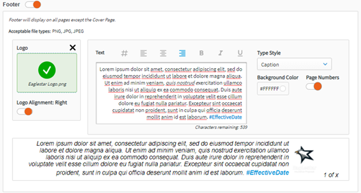 You can select and format which text appears on your cover page by choosing which to toggle ‘On’ or ‘Off.’ You can also select different Type Styles and Colors for each piece of text.
