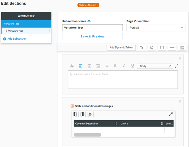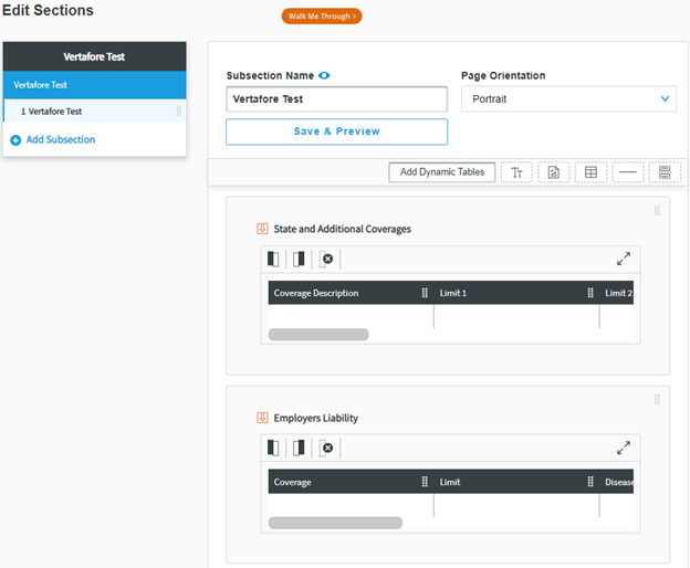 If you have created a new section that can import AMS360 policy and line of business data, you can add placeholders amongst other elements by clicking Add Dynamic Tables in a subsection that you have created. For example, you may wish to combine coverage limits and vehicle schedule infor-mation from AMS360 with additional information that users need to input themselves.