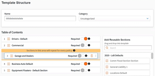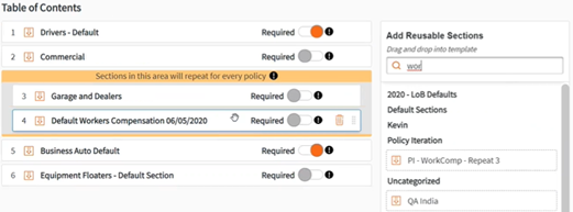 All proposal templates now have added functionality to allow for sections to repeat for every appli-cable policy. This will apply to any sections that are included within the orange box (repeatable box) that states “Sections in this area will repeat for every policy”. This feature also separates dynamic fields included in these sections.