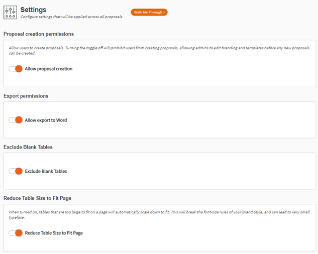 Export Permissions manage whether users can export the proposal to Word for further editing. This setting is ‘On’ by default.