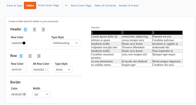 In Tables, you can set the standard appearance of each table that will appear in your proposal. You can review and set the color and type style for headers and rows, as well as the color width of the table border.