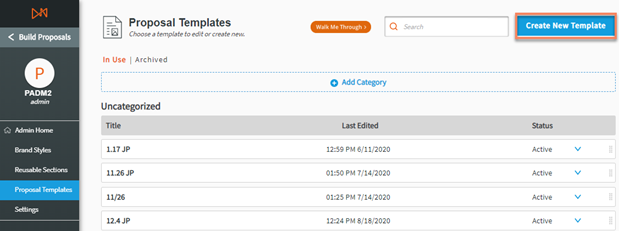 Note: Brand Styles, Reusable Sections, and Proposal Templates must be in Active status to be used in creating proposals |
