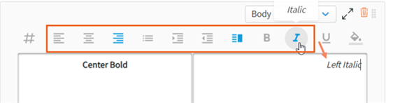 Formatting options (font, alignment, bold, italic, etc.) for the text areas are separate, and apply to whichever box is selected.