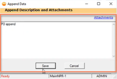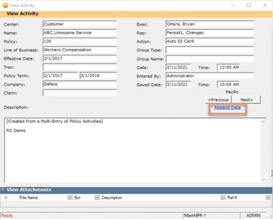 This will open a new Append Data winform. Here, you can add any additional text to the description or attach files to the Activity. When you are finished adding your information, click Save.