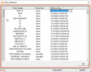 After clicking Select Multiple, the Policy Selection window will open, showing all available policies for selection. The policies can be sorted by Policy Number, Policy Status, or Effective Date, by selecting the respective column headers.