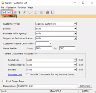 The Report – Customer List winform now has a Save and Save & Close button, allowing you to save your inputted values and revisit them later.