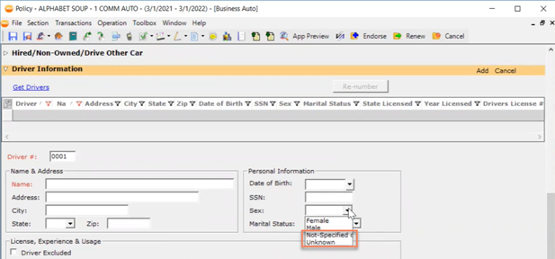 Commercial Auto Driver Information: New Gender Codes