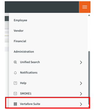 Step 5: If you have entering via the Hamburger, clicking on it will activate a drop-down menu, where the Bento Box/ Vertafore Suite will be available (see Figure 3):
