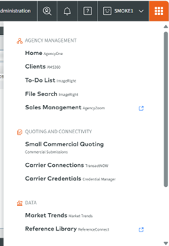 Step 1: Log into the Global Nav environment with your VSSO-enabled user credentials that were configured with Agency One and AMS360 products. Other integrated products include Commercial Submissions, Credential Manager, PL Rating, ImageRight, and Reference Connect.