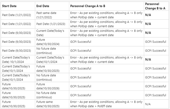 Users could not change personnel back to an employee previously listed on the policy, which resulted in a duplicate employee error message. Users can now change employee A to B (existing functionality) and then change B to A (new functionality) without seeing a "Duplicate" error message.