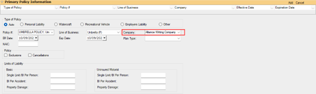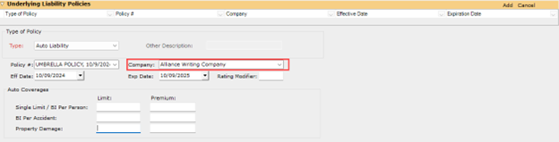 In earlier versions, the “Underlying Liabilities Policies” and “Primary Policy Information” sections in the personal and commercial umbrella lines of business defaulted to the Policy Parent Company in the company drop-down menu. With this release, these sections now default to the writing company in that drop-down.