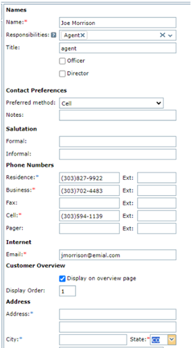 Next, for each of these Contacts fields, you can use the radio button to decide if the field is (a) "Required" for saving the customer (as indicated by a red asterisk next to that field name in Customer Contacts). (b) "Recommended" as important to enter (as indicated by a blue asterisk) where you can save with or without entering a value, or (c) "Optional," which is less important and a choice that allows you to save with or without entering a value.