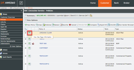To take advantage of this feature, navigate to the Customer Center > search and open a customer > select the View Dec Page Information icon to the left of the policy: