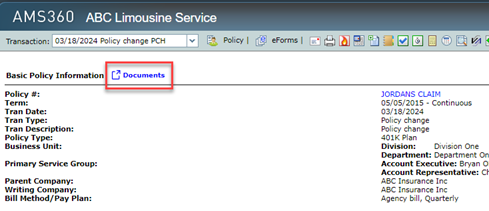 The declarations page will open in a new tab. Assuming you are an ImageRight user, you will be able to click on the "Documents" link next to Basic Policy Information: