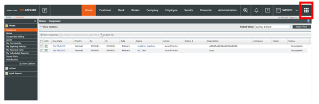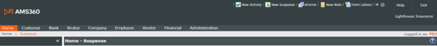 When you log in as an AMS360 user, the Top Navigation Bar will look like this if your default start page is Home, Suspense for example. Changes are limited to the white bar that has the Agency on the far right and the black Top Navigation bar above it. Everything below the white bar remains unchanged.